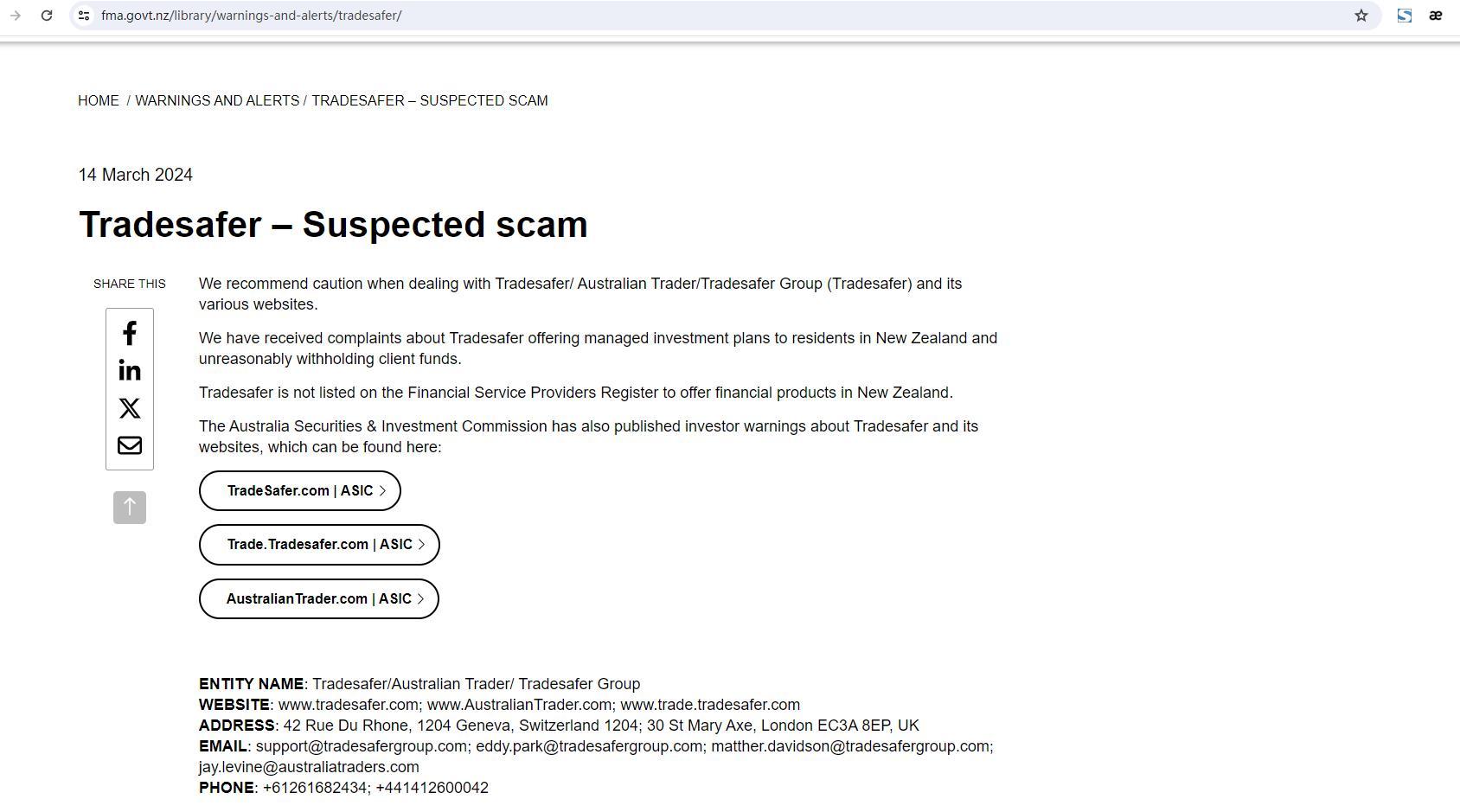 2024 年 3 月 14 日 Tradesafer– 怀疑是骗局,我们建议谨慎处理 Tradesafer/ 澳大利亚贸易商 / Tradesafer团体 ( Tradesafer )及其各个网站。我们收到了关于 Tradesafer向新西兰居民提供管理投资计划,并不合理地扣留客户资金。 Tradesafer未列入新西兰金融服务提供商名录,不得提供金融产品。澳大利亚证券和投资委员会还发布了有关投资者的警告 Tradesafer及其网站,网址为: Tradesafer .com | asic 贸易。 Tradesafer .com | asic australiantrader.com | asic 实体名称: Tradesafer /澳大利亚贸易商/ Tradesafer集团网站: www. Tradesafer .com; www.australiantrader.com; www.trade. Tradesafer .com 地址:42 rue du rhone, 1204 geneva, switzerland 1204; 30 st mary axe, london ec3a 8ep, uk 电子邮件:support@ Tradesafer group.com; eddy.park@ Tradesafer group.com; matther.davidson@ Tradesafer group.com;jay.levine@australiatraders.com 电话:+61261682434;+441412600042