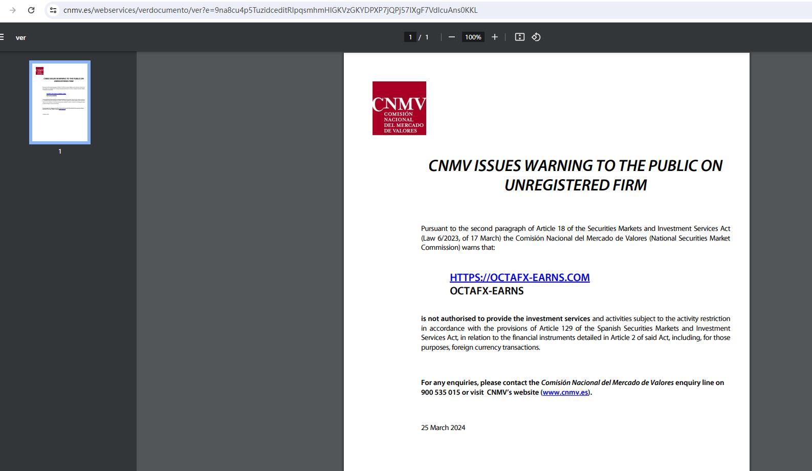 cnmv 向公众发出关于未注册公司的警告 根据《证券市场和投资服务法》(2023 年 3 月 17 日第 6/2023 号法律)第 18 条第二款,国家证券市场委员会 (comisión nacional del mercado de valores) 警告称:https:// Octafx-earn s.com Octafx-earn根据西班牙证券市场和投资服务法第 129 条的规定,s 未获授权提供受活动限制的投资服务和活动,涉及该法第 2 条详述的金融工具,包括为此目的的外汇交易。如有任何疑问,请致电国家证券市场委员会咨询热线 900 535 015 或访问 cnmv 网站 (www.cnmv.es)。2024 年 3 月 25 日