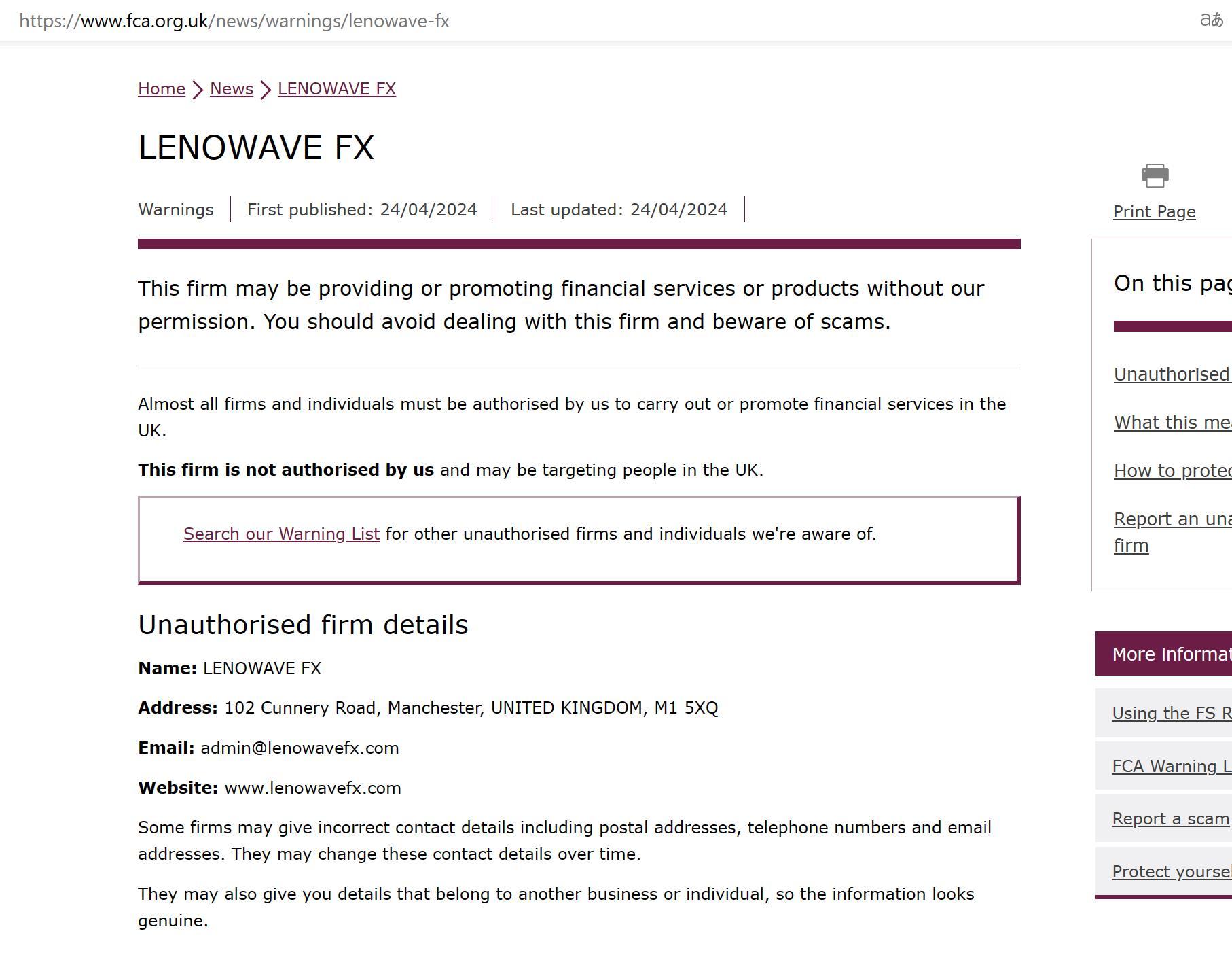 FCA未经授权公司警告名单 LENOWAVE FX.