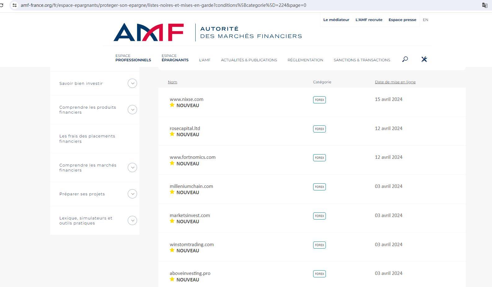 这是法国金融市场管理局 (AMF) 列入黑名单的公司或网站、警告和/或受监管公司的违规行为的列表。