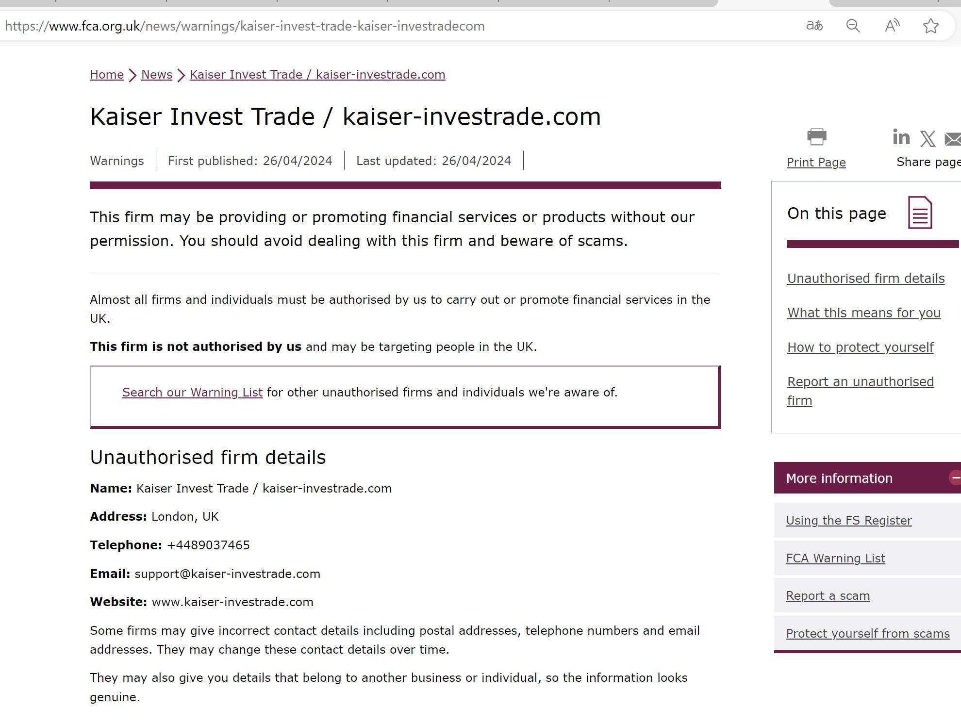 FCA未经授权公司警告名单:Kaiser Invest Trade.