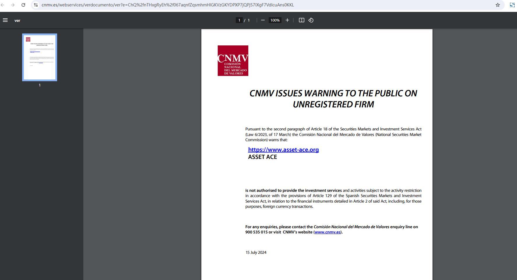 CNMV 就未注册公司向公众发出警告 根据《证券市场和投资服务法》(2023 年 3 月 17 日第 6/203 号法律)第 18 条第二款,国家证券市场委员会 (Comisión Nacional del Mercado de Valores) 警告称:https://www.asset-ace.org ASSET ACE 未获授权提供根据西班牙证券市场和投资服务法第 129 条的规定受到活动限制的投资服务和活动,涉及该法第 2 条详述的金融工具,包括为此目的的外汇交易。如有任何疑问,请致电国家证券市场委员会咨询热线 900 535 015 或访问 CNMV 网站 (www.cnmv.es)。2024 年 7 月 15 日