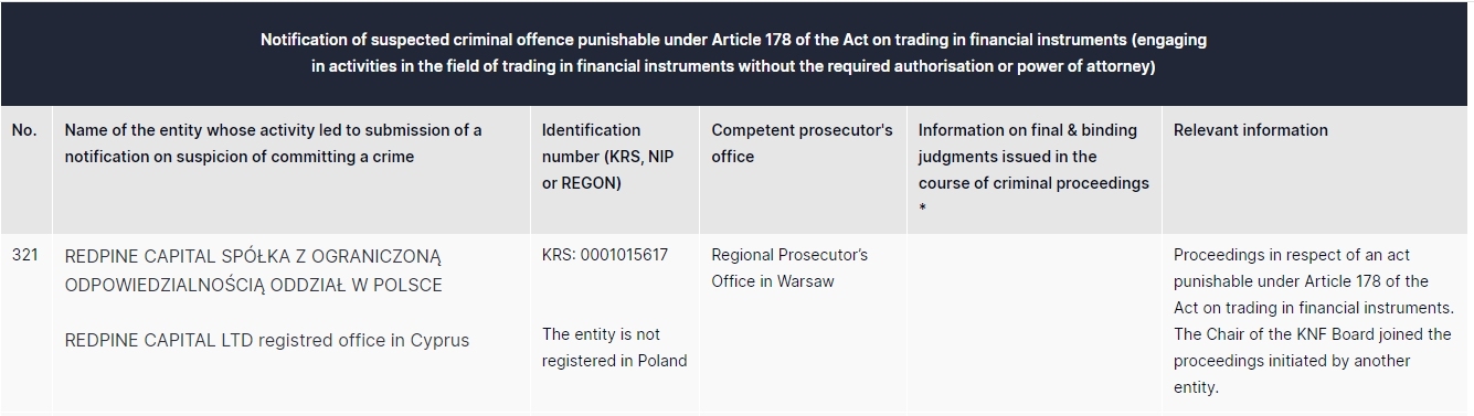 红松资本 spółka z ograniczoną odpowiedzialnością oddział w polsce Redpine Capital Ltd塞浦路斯注册办事处 krs: 0001015617 该实体未在波兰注册 华沙地区检察官办公室根据《金融工具交易法》第 178 条对一项应受惩罚的行为提起诉讼。knf 董事会主席加入了另一方发起的诉讼实体。
