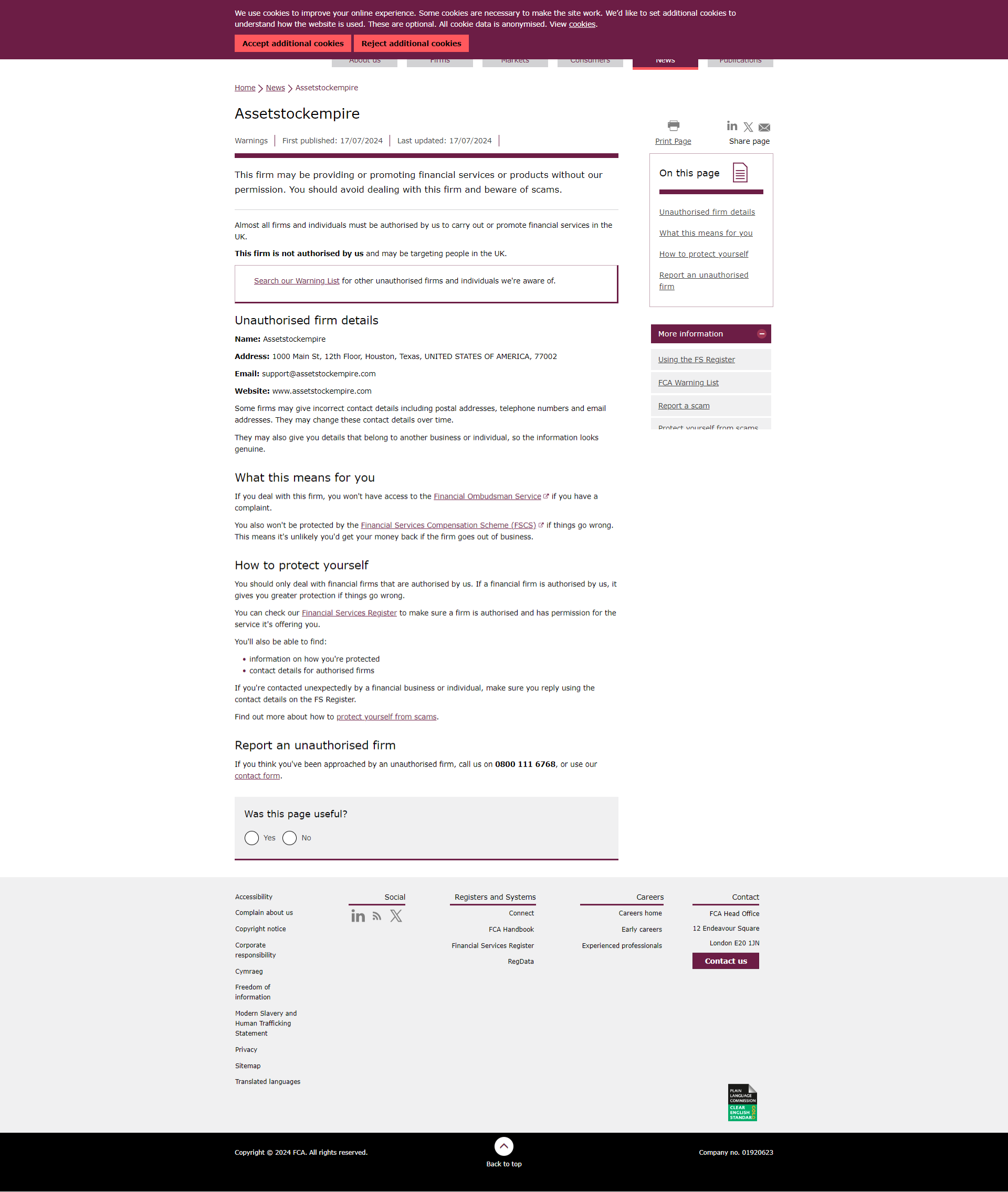FCA未经授权公司警告名单 Assetstockempire.