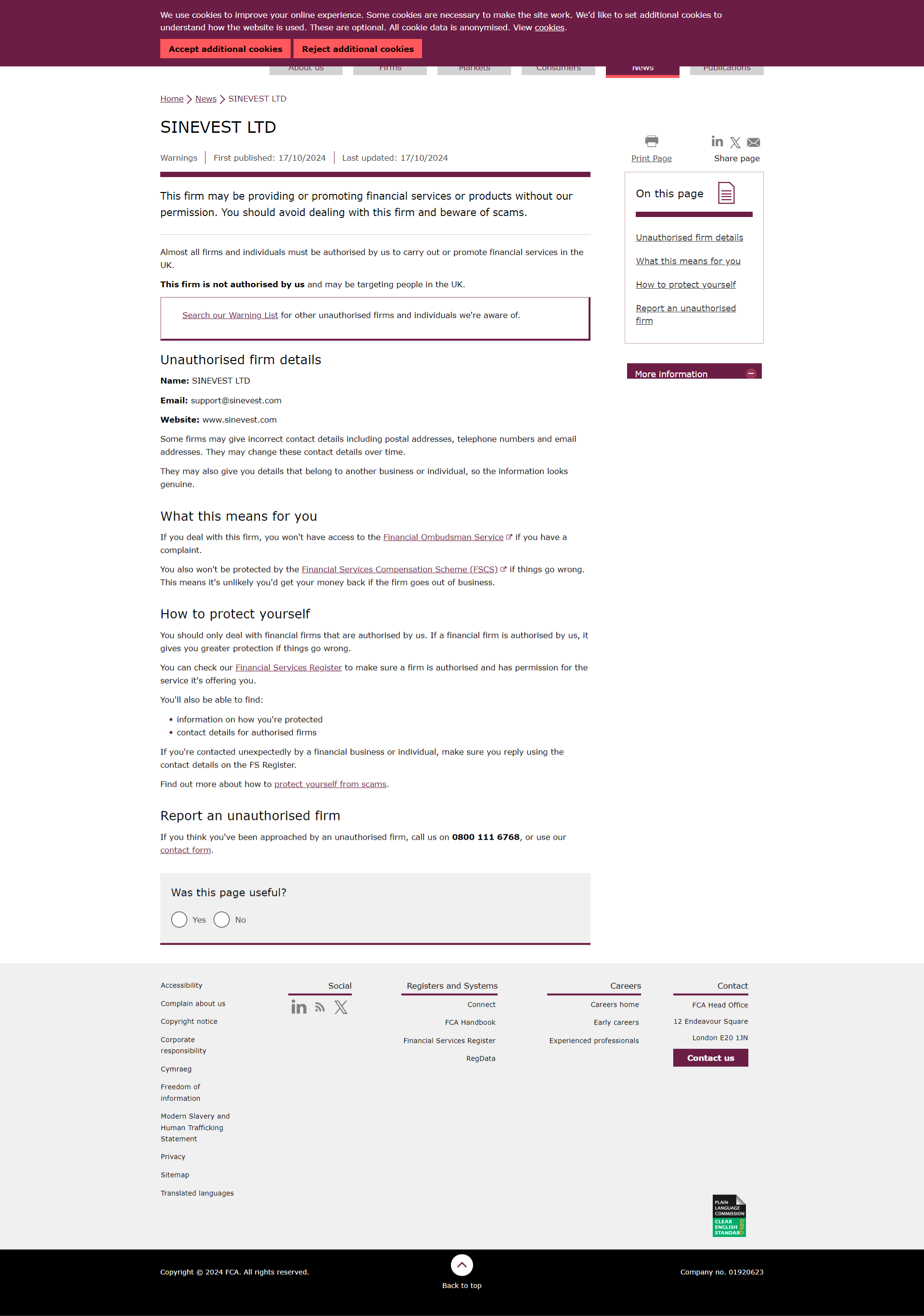 FCA未经授权公司警告名单 SINEVEST有限公司.