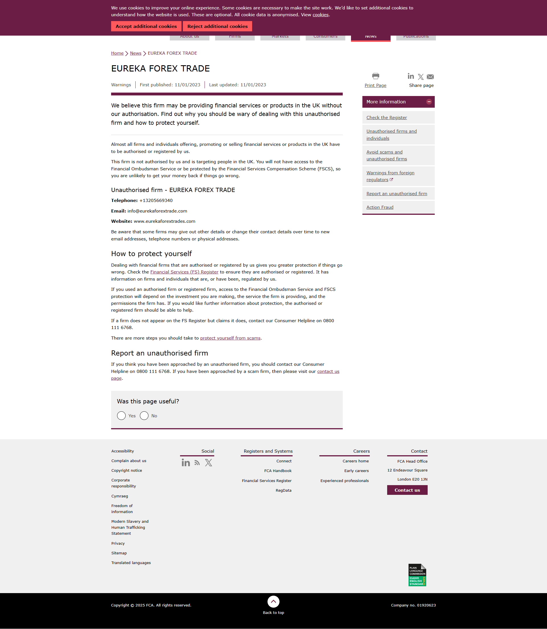 FCA未经授权公司警告清单:EUREKA FOREX TRADE.