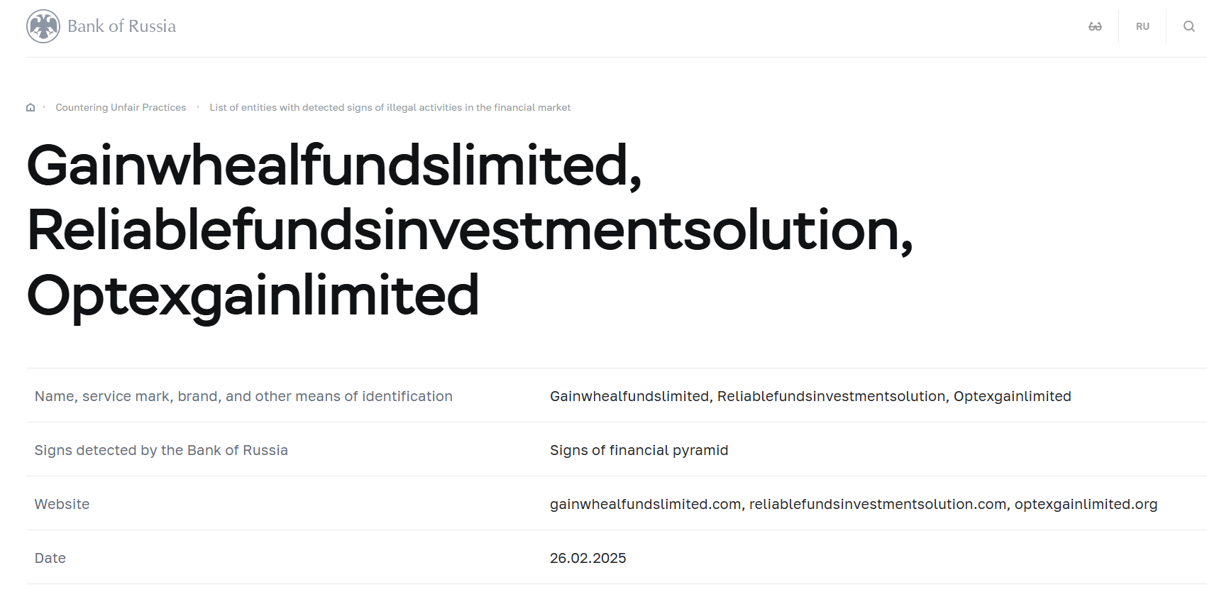 金融市场中检测到非法活动迹象的实体名单 Gainwhealfundslimited(增益财富基金有限公司), Reliablefundsinvestmentsolution(可靠基金投资解决方案), Optexgainlimited(奥普特克斯增益有限公司).