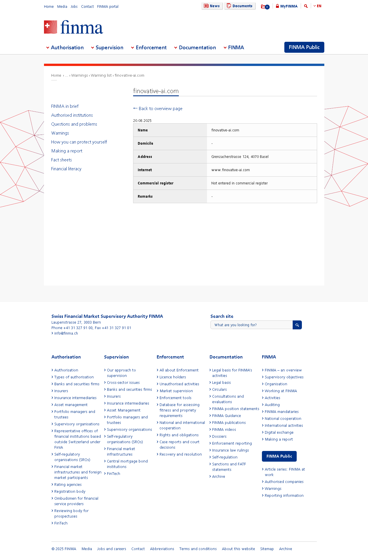 公开警告 可能从事未经授权服务且不受FINMAfinovative-ai.com监管的公司和个人名单.