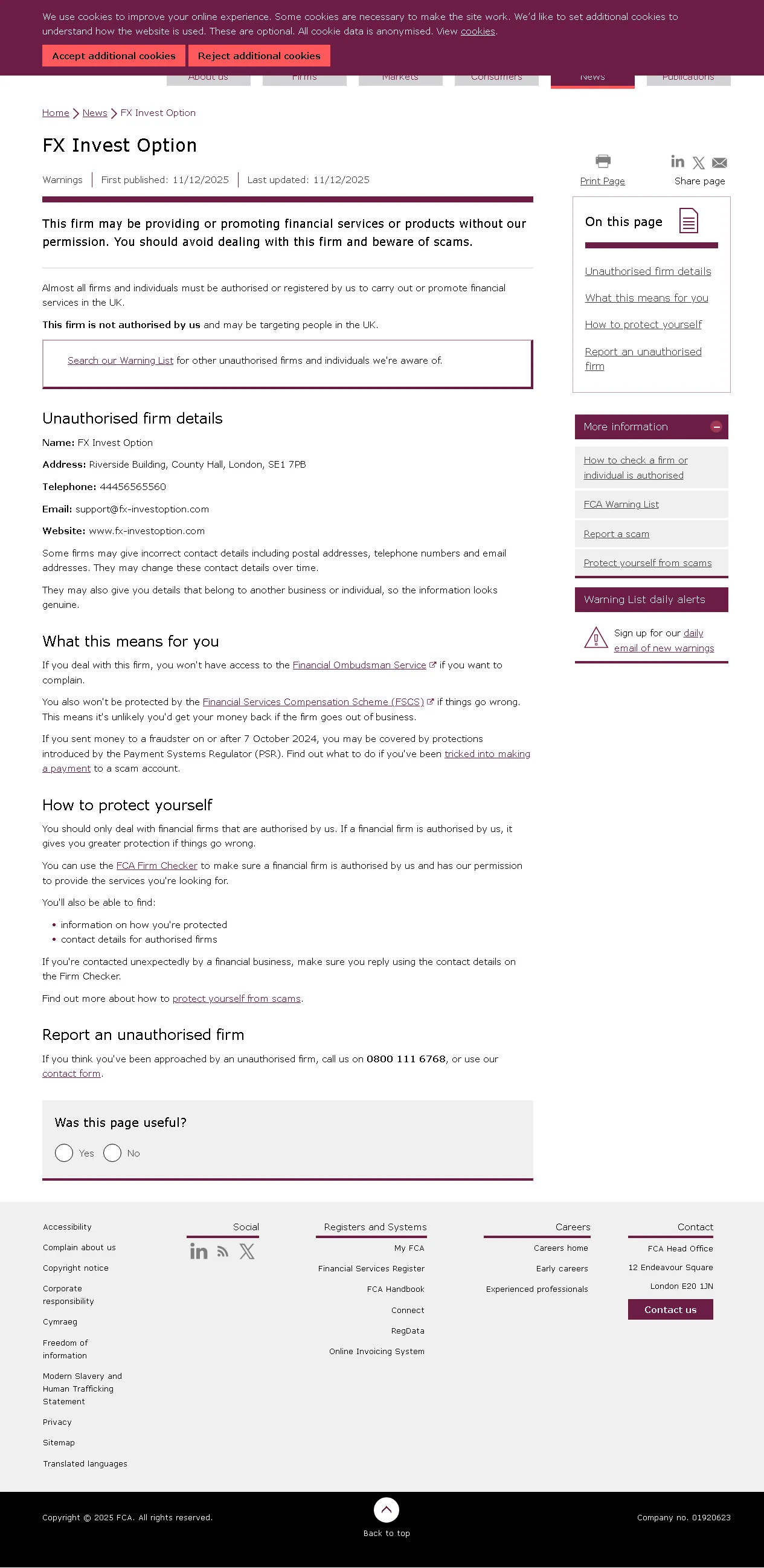 FCA未经授权公司警告名单 FX Invest Option.