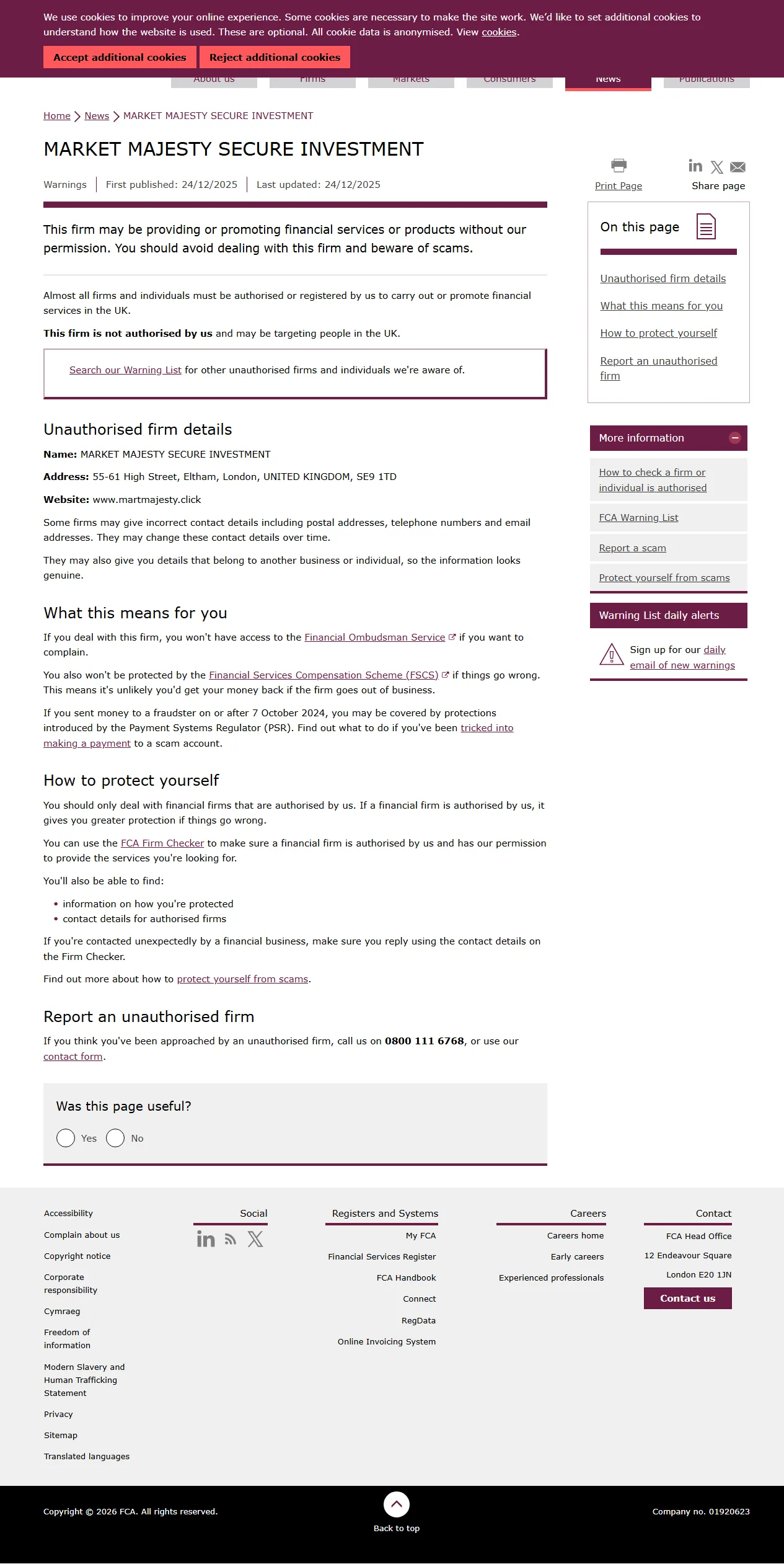 FCA 未经授权公司警告名单 MARKET MAJESTY 安全投资.