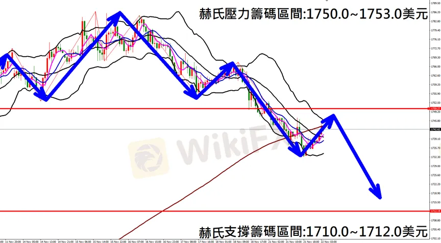 今日黃金(11月22日) 早盤在1737.8附近,從技術分析面切入,1小時級別觀察走勢架構符合昨日(21日)預測K棒盤中拉回修正,空單獲利入袋,目前K棒反彈上漲,仍保持下降通道,因此建議佈局空單為主。