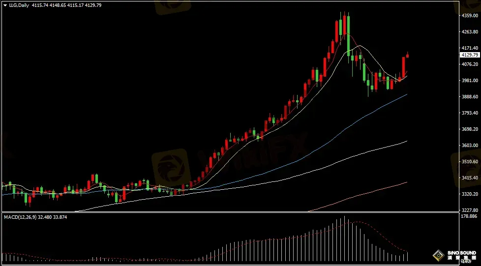 昨日現貨黃金價格大幅上漲後,今日早盤金價再創新高至4148.65美元/盎司,隨後振盪回落整理,截止漢聲集團分析師發稿前,金價在4129美元附近運行,漲幅收窄至0.34%。現貨白銀維持在50美元關口上方運行,現報50.65美元/盎司,上漲0.36%。
