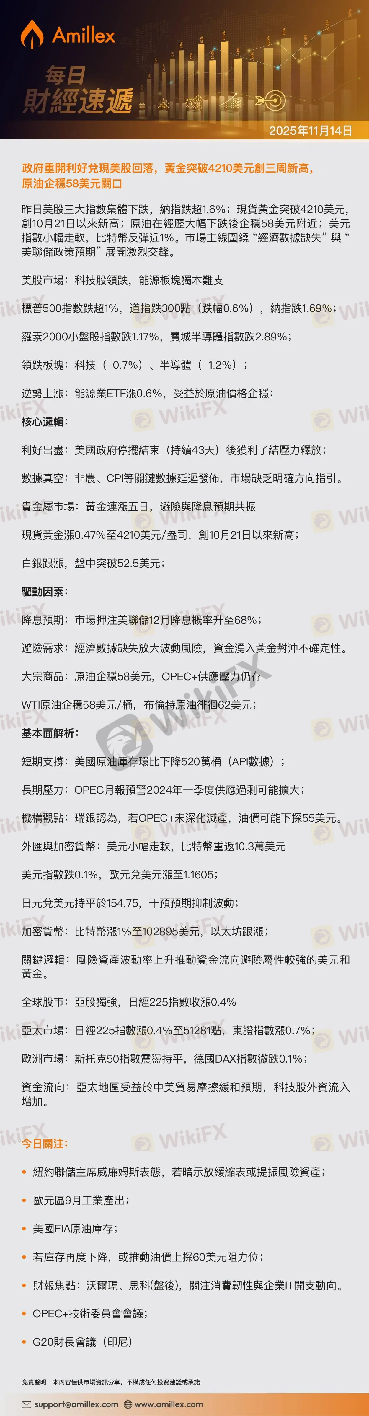 Amillex每日匯評:政府重開利好兌現美股回落,黃金突破4210美元創三周新高,原油企穩58美元關口