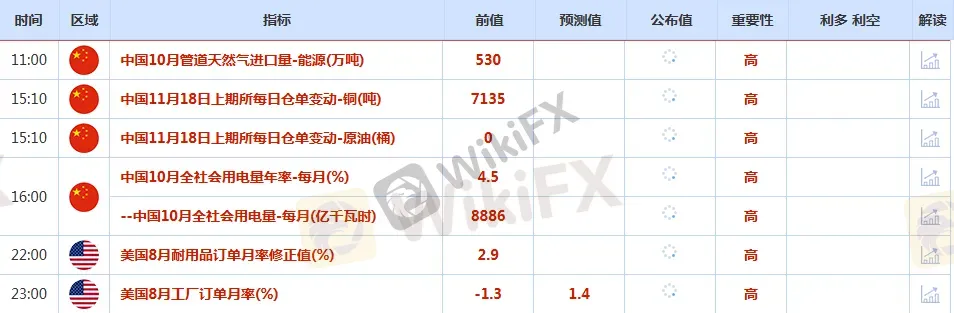 儘管日本第三季度GDP環比年率下滑1.8%,為六個季度以來首次下降,但日元反應有限。英鎊兌美元下跌0.19%,報1.3150美元,市場關注英國政府即將於11月26日公布的預算案。