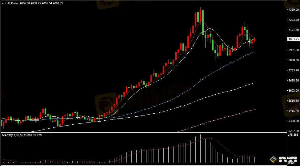 金價日線圖看,日內金價振盪上漲最高觸及4098美元附近,目前金價多空雙方在5日與10日均線膠結處形成激烈爭奪。如金價能夠順利站上4100美元關口,則有望走出一波上漲行情,但由於今晚美聯儲公佈貨幣政策會議紀要,估計此前市場情緒相對糾結。指標看,MACD指標正動能柱有所減少,RSI指標在54位置附近徘徊。