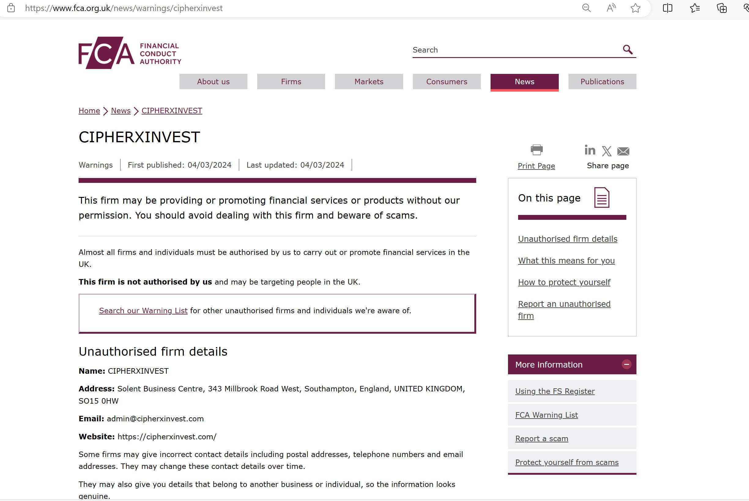FCA未獲授權公司警告名單 CIPHERXINVEST.